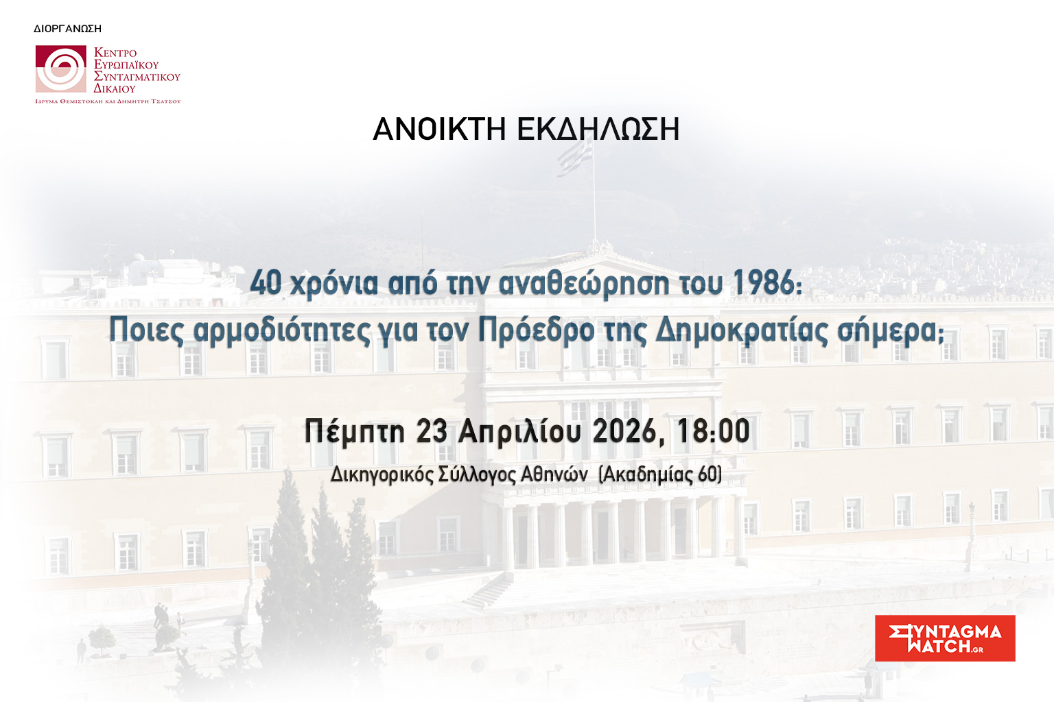 Το Κέντρο Ευρωπαϊκού Συνταγματικού Δικαίου – Ίδρυμα Θεμιστοκλή & Δημήτρη Τσάτσου και Παρατηρητήριο Συνταγματικών & Θεσμικών Εξελίξεων Syntagma Watch σας προσκαλούν στην ανοικτή εκδήλωση με θέμα «40 χρόνια από την αναθεώρηση του 1986: Ποιες αρμοδιότητες για τον Πρόεδρο της Δημοκρατίας σήμερα;».